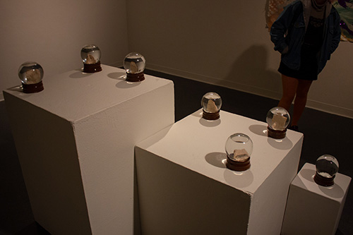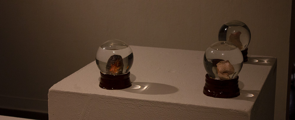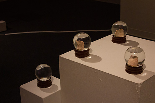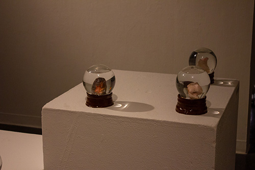 inside the snow globes are fragmented, ambiguous body parts, such as a nose, a cheek, a wrist, a bald spot. each idiosyncratic to its owner, enclosed within a tiny, separate reality that is frozen. these spheres are souvenirs and relics of a memory. the body parts are created from material that would slowly waste away, honoring how memory fogs and loses its luster over time.